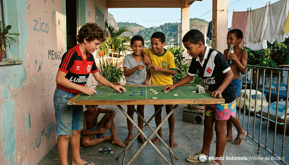 Nas ruas, nossa diversão eram as brincadeiras de rua, queimado, pipa, pião, bola de gude e, logicamente, o nosso futebol de botão. Acontecia na calçada, na garagem da casa da avó de alguém, embaixo de uma árvore em dias de sol escaldante. Era na rua que a nossa socialização acontecia; ali aprendemos muitos dos nossos valores, resolução de conflitos, lealdade, amizades duradouras. Tudo acontecia em torno da rua. O trânsito era livre para os pré-adolescentes da época, e o futebol de botão estava lá presente, forte, competindo com tudo e todos, inclusive o ancestral dos