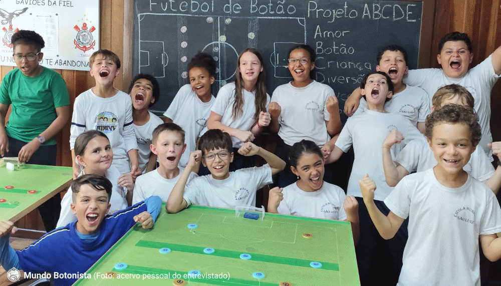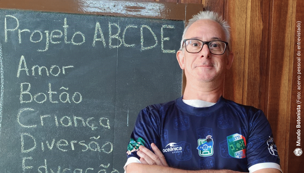 Em 2021, já em Curitiba, reencontrou a vidrilha. Encantou-se pela simplicidade, pelo baixo custo e pelo controle com a pastilha – um convite para ampliar o acesso. Em plena pandemia, decidiu que era hora de apostar nas crianças. Bateu à porta do Lar Meninos de São Luiz, entidade centenária do bairro Água Verde, apresentou-se como voluntário, construiu mesas e começou. Em outubro de 2022, iniciou aulas para turmas de 4ª e 5ª séries, ensinando do primeiro toque ao chute, com atenção plena, honestidade e autocontrole. Seus treinos viraram “desafios”: conduzir a bola pela linha verde sem sair, alinhar dez botões para parar exatamente na faixa, pênaltis para treinar direção e força. Há também ética em quadra: o jogo ensina responsabilidade e honestidade! Lembra que pesquisou e descobriu que há apenas dois esportes em que “não há juiz”: além do próprio futebol de botão, o ultimate frisbee.